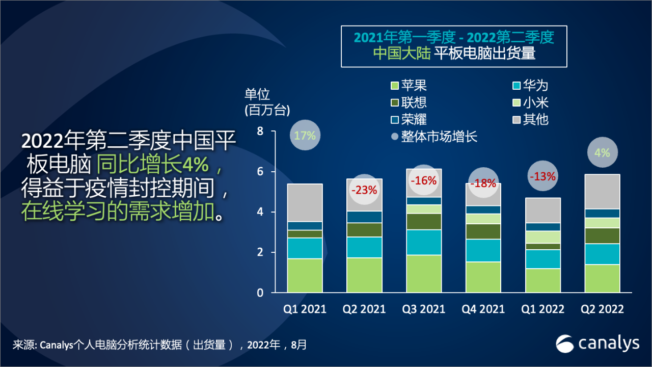 Xu 持续说道:“第二季度,因为新冠疫情的封闭,大部分儿童和大学生只能在线学习,因此影响了平板电脑的需求上升。华为和苹果等头部厂商正在推行一些新的装备和功用,如更大的护眼屏幕、触控笔和跨设备操作功用,以进步出产力。芯片问题使得华为平板的开展受限,这让小米和荣耀等厂商看到更多竞赛时机,经过推出具有相似功用但却更平价的平板来抢占商场。抢先的本地厂商正在从低赢利的入门级产品商场搬运,加大中高端产品的投入,以进步与它们生态中其他产品的协同效应,然后在设备互联的商场中占有更大的比例。”