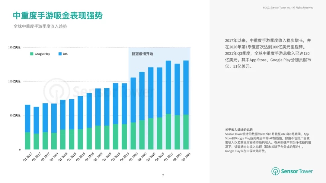 2017年以来,中重度手游季度收入出现稳步增长。跟着2020年头新冠疫情的迸发,更多手机用户涌入移动游戏商场,使得中重度手游季度收入初次到达100亿美元里程碑。2021年Q3,全球中重度手游总收入已达130亿美元。