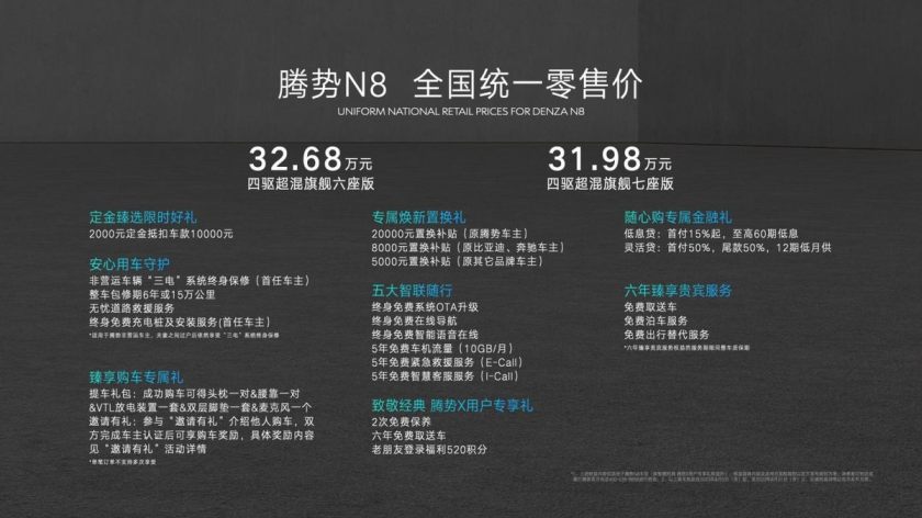 智能奢华全场景SUV腾势N8正式上市,共推出两个版别车型,四驱超混旗舰六座版32.68万元,四驱超混旗舰七座版31.98万元。作为腾势品牌焕新之后N系列第二款车型,腾势N8具有中大型SUV的越级空间,统筹舒适家用和野外越野的极致产品力,打造出城市越野全场景驾御,通勤家庭全人物驾御,超强混动全动力驾御。其具有超卓驾控功用、老练三电技能、丰厚文娱装备、奢华可变空间等各项长板,是30万级SUV商场中仅有全场景兼用的车型。