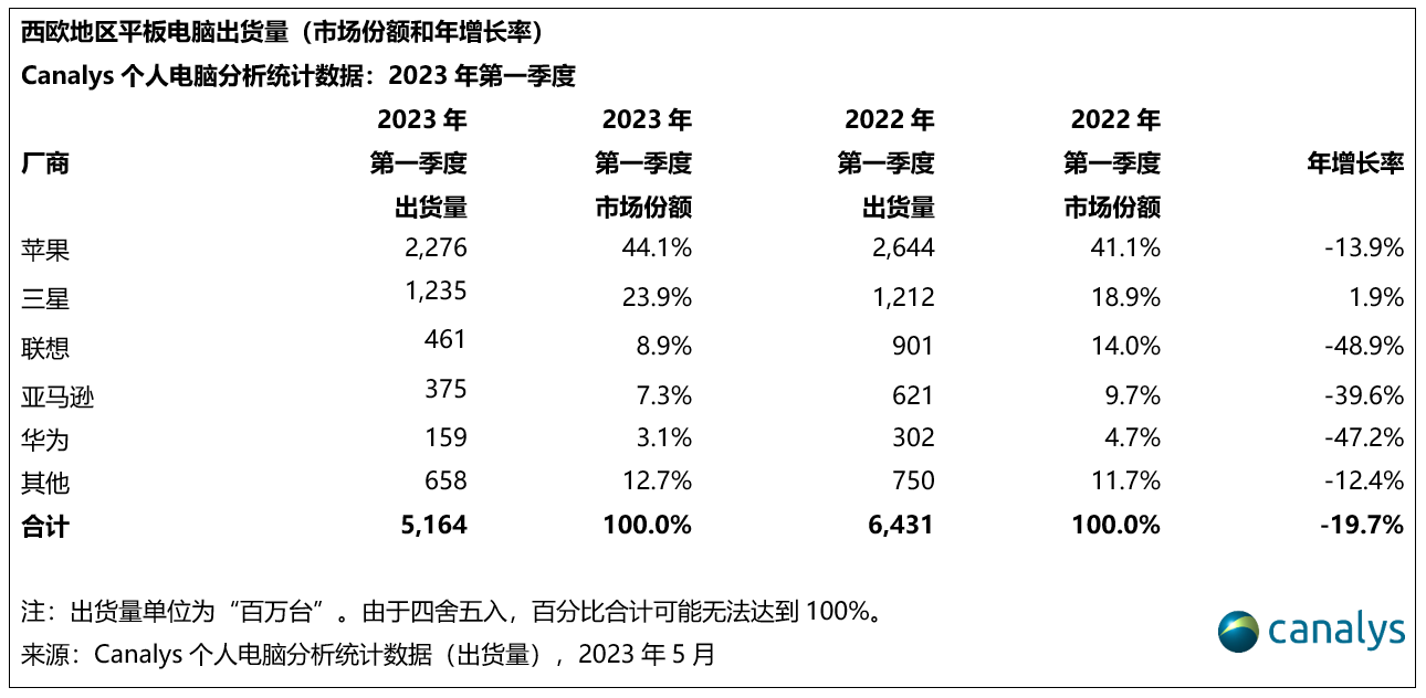 依据Canalys发布的最新陈述,2023年第一季度,西欧区域的个人电脑(PC)出货量(台式机、笔记本电脑和作业站)同比跌落37%至1000万台。两大个人电脑品类面对明显的降幅,其间笔记本下降37%至810万台,台式机出货量下降35%至190万台。平板电脑体现略好,但出货量仍同比下滑20%至520万台。Canalys最新猜测,2023年西欧区域的个人电脑及平板电脑出货量全年将别离下滑9%和12%。但是,两大设备类型商场已有复苏的痕迹,有望在2023年的剩下季度继续增加,并在2024年提速。